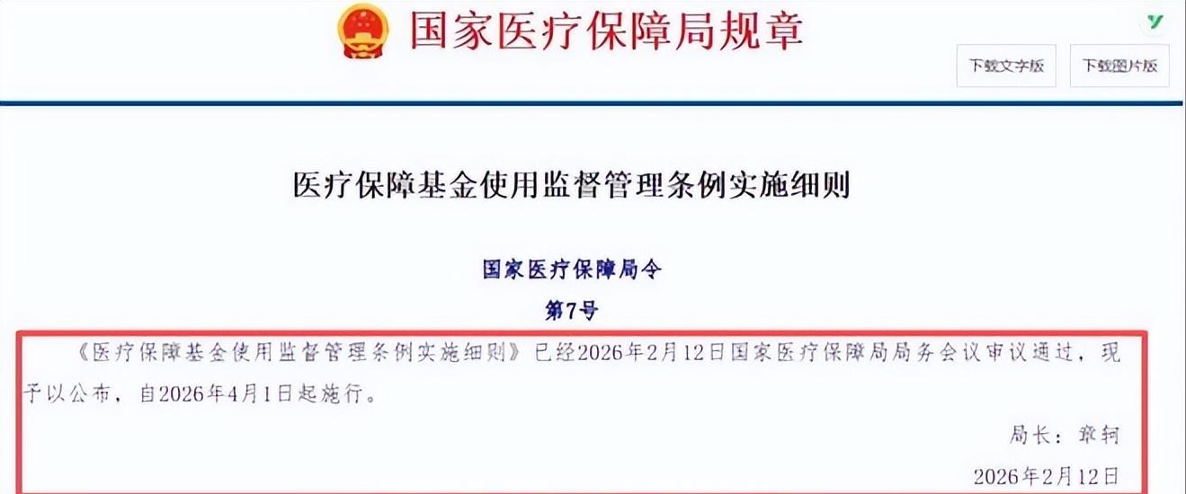 引言就在3月初,国家医保局正式发布第7号令——《医疗保障基金使用监督管理条例实施细则》,这份重磅文件已经在2026年2月12日经国家医保局局务会议审议通过,将于2026年4月1日起在全国统一施行。