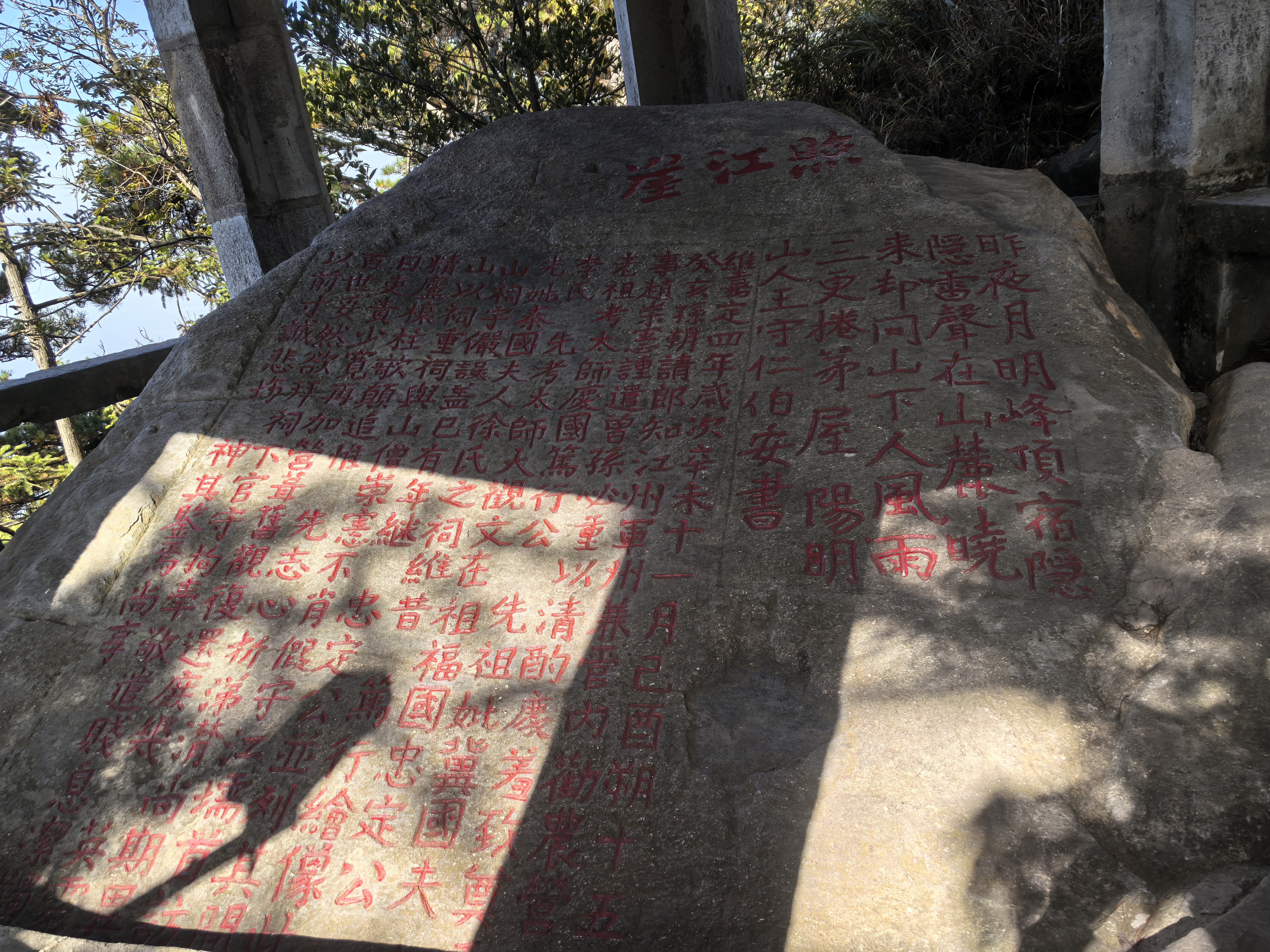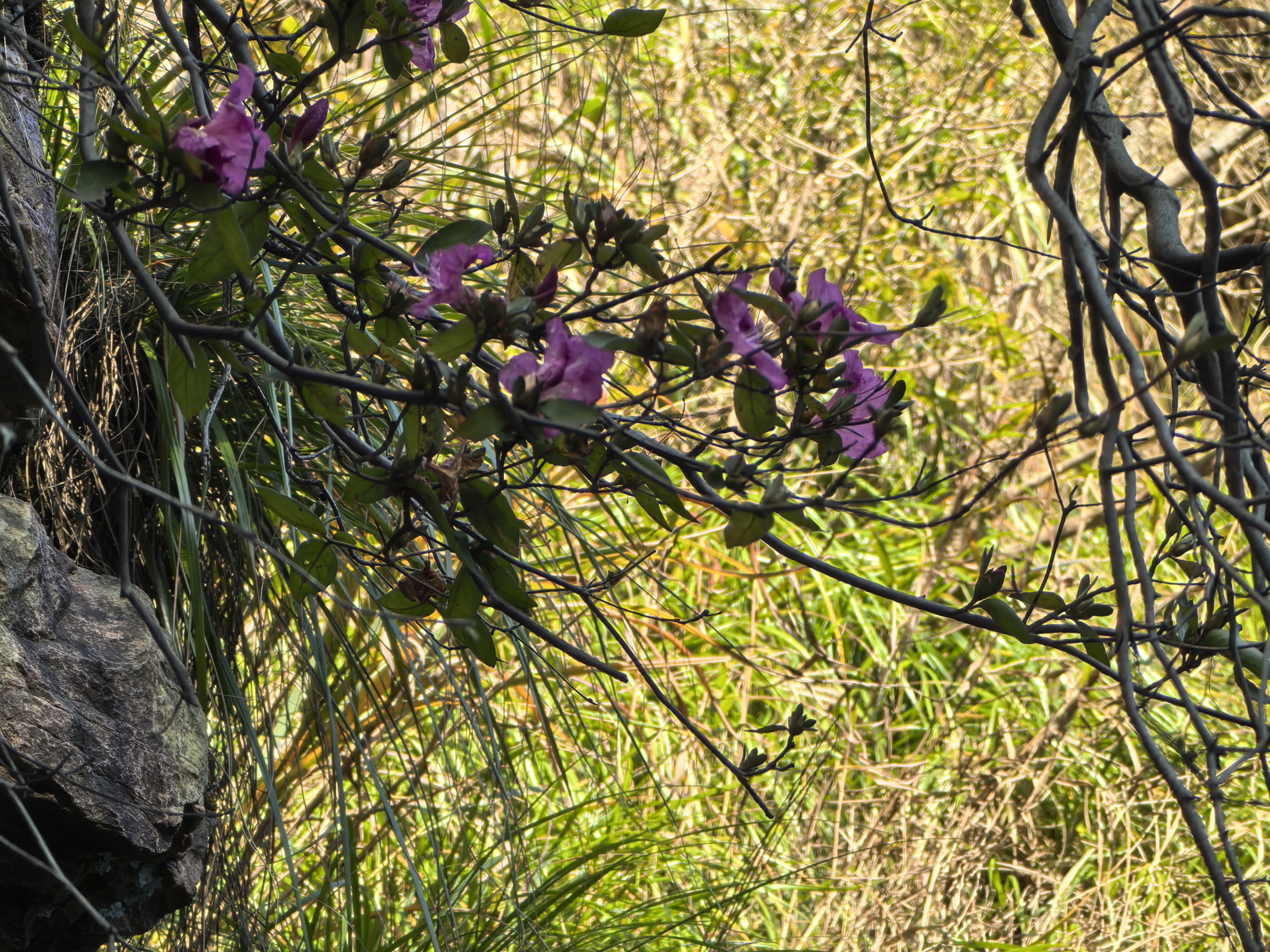 我倒是感觉这段峡谷台阶路走得很惬意,两边树木很茂盛,阳光透过树木,照在台阶路上斑驳一片,边上是小溪哗哗的声音,夹杂着鸟鸣声。奇怪的是我的腿疼了好几天了,现在却不疼了,走起来非常轻松。初冬季节,在路边的山崖上还发现了一株红花,临时兴起,还做了一首诗: