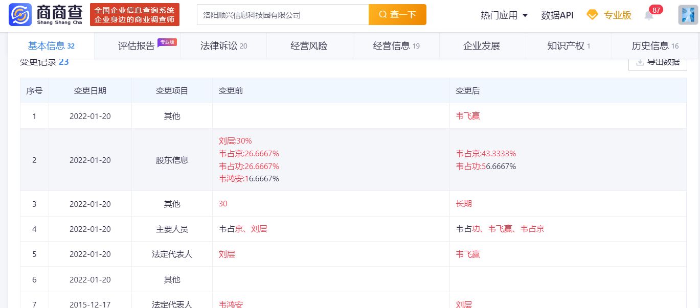 商商查APP信息显示,2022年1月20日,韦家的科技园投资人和法定代表人变更,刘某和韦全退出股东。变更后,韦城、韦勋分别持股43.3333%和56.6667%。