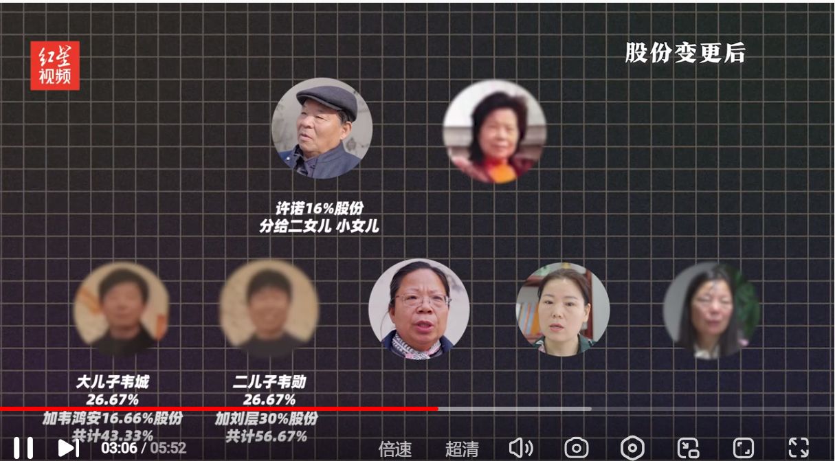 女儿韦莉提供相关材料显示,父母各自的股份分别以1000元价格,转让给了大哥、二哥。她称,自己曾提出将父亲名下16%的股份,给她和妹妹各8%就行,二哥答应找大哥商量,但此后多次沟通无果,兄妹矛盾越来越大,甚至大大出手。2022年11月,她以父亲名义将大哥起诉至法院,要求撤销股权转让。
