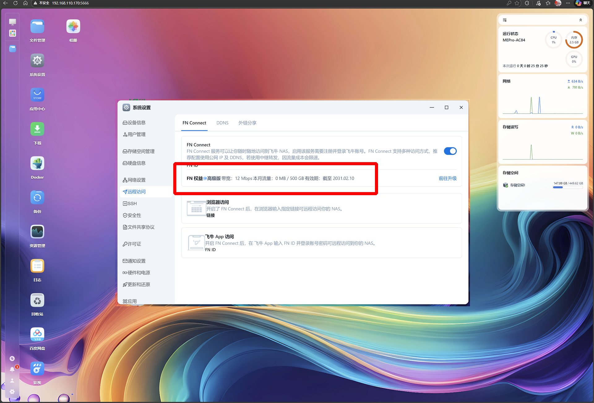 本次零刻ME PRO预装的是商务版的飞牛系统,除了本身更安全等的特质外,就是它提供了一个12Mbps 带宽,500GB/月的极速流量。特别适合在外地有远程调用素材诉求的友友们。