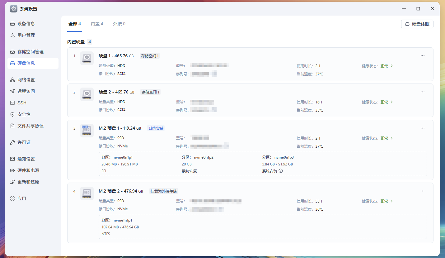 同时,我们也对系统数据中的硬盘温度进行了读取,可以看出,它的整体温度不高,HDD的温度分别为35℃、37℃,固态硬盘的温度为36℃。在NAS界,这基本上相当于把硬盘扔到冰箱里面了。