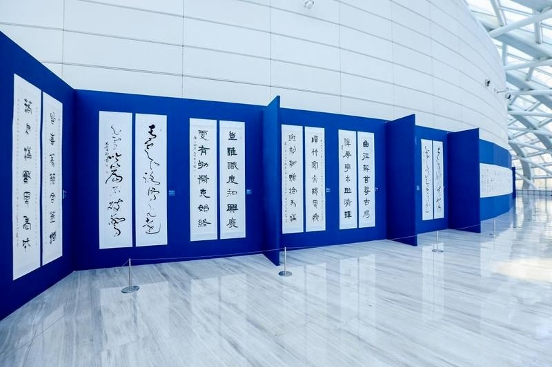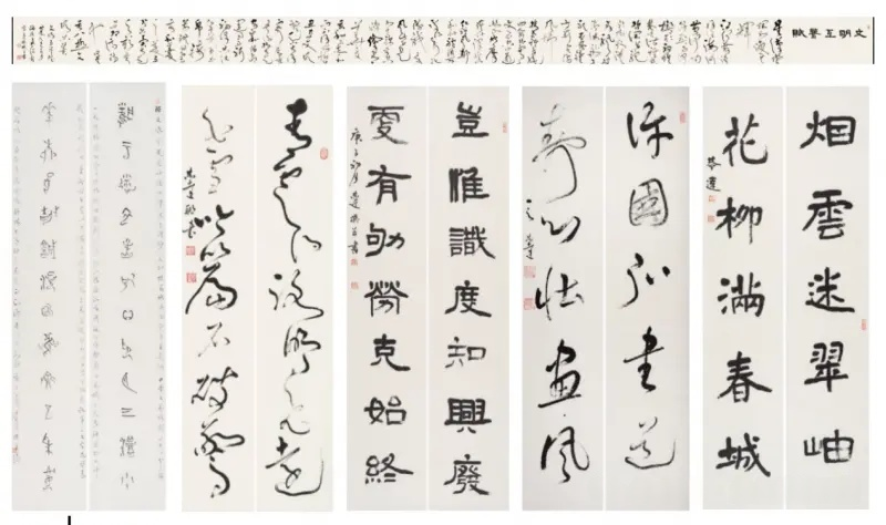 特别值得关注的是,言先生始终坚持以"篆籀笔法"作为贯穿各体的"祖线",这使得不同书体之间既有鲜明的个性特征,又有内在统一的笔墨基因。每一副楹联的内容均为先生自撰,文辞精炼而意境深远,将传统文化的精髓与现代人文思考完美融合,真正做到了"文墨相生,诗书合一"。二十米大草长卷:天地对话写胸怀展览的核心巨制——二十米大草长卷《文明互鉴赋》,堪称当代书法艺术的里程碑之作。这件作品的创作背景具有特殊的时代意义:2025年,由中国倡议、联合国大会通过决议,将每年6月10日设立为"文明对话国际日"。言恭达先生敏锐地把握这一历史契机,以艺术家特有的敏感与担当,创作了这篇呼应时代主题的鸿篇巨制。