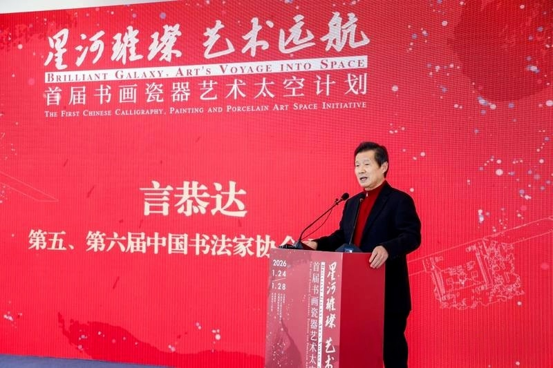 星河流转,笔墨生辉。1月24日,由中国外文局文化传播中心和凤凰国际传媒中心联合主办的“星河璀璨,艺术远航”首届书画瓷器艺术太空计划,在凤凰国际传媒中心成功举办,本次展览汇集言恭达、邱笑秋、郭怡孮、李菊生、车鹏飞、范扬等六位艺术家200余件书画瓷器精品,通过地面展览与太空展播的“天地共屏”模式,推动中华优秀传统文化创造性转化。其中,言恭达先生以一场融贯古今、天地联动的艺术呈现,为太空计划注入了深邃的文化内涵。他此次参展的15件精品力作,构成了一部立体展现中国书法精神谱系的视觉史诗。