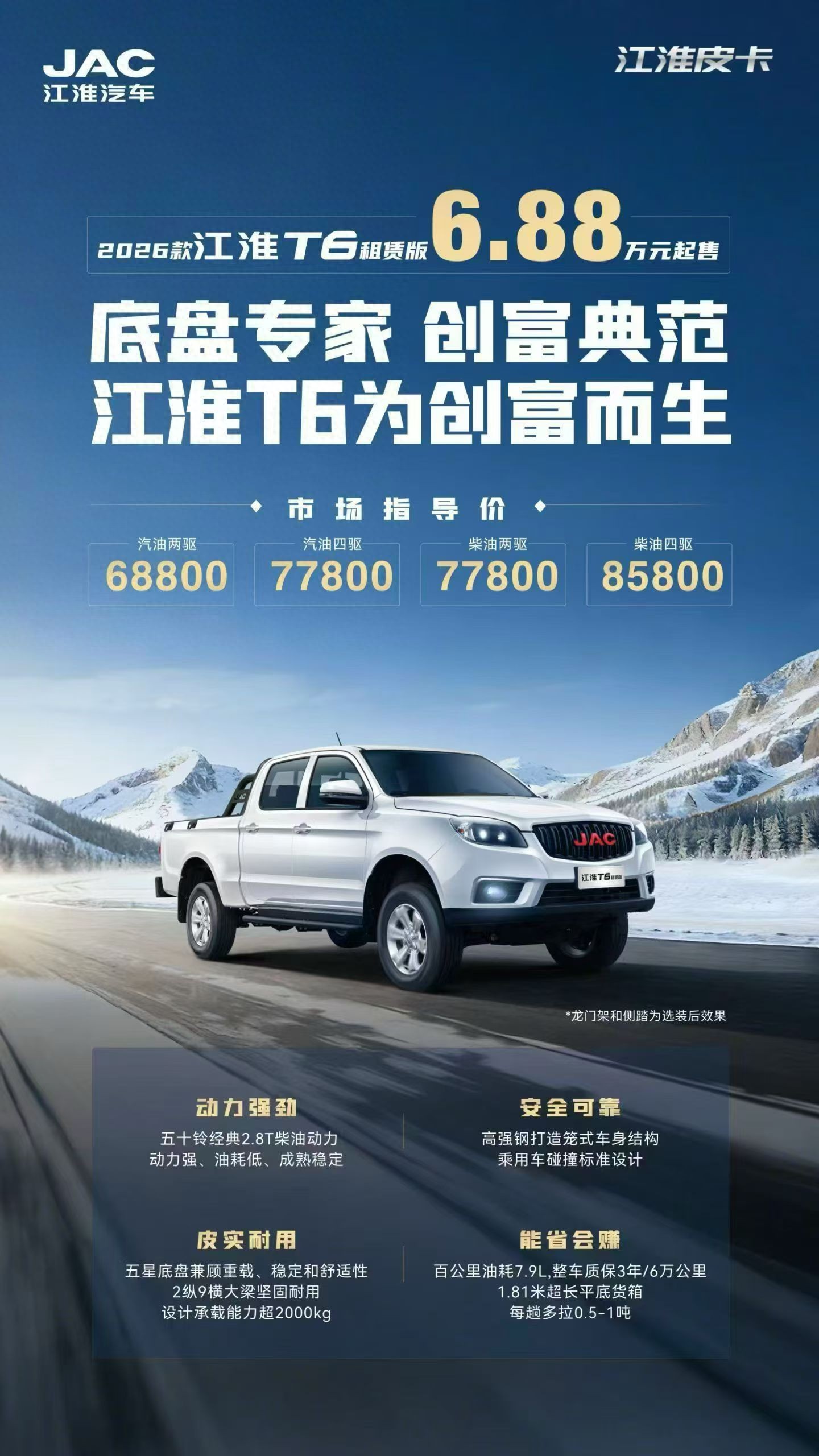 随着城乡物流、个体创业及工程建设等领域的需求持续释放,商用皮卡市场依旧火爆,且用户希望买得起、拉得多、用得省、赚得多。底盘专家,创富典范!江淮皮卡精心推出为创富而生的2026款江淮T6租赁版,以极致的产品优化和6.88万元起的亲民售价,成为租赁公司、市政单位及私营业主的采购优选。