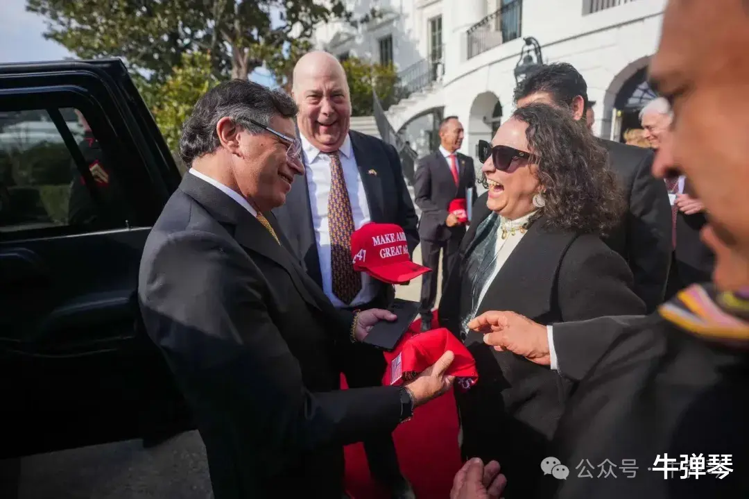 特朗普签名送书,而且是1987年出版的著作,他还对佩特罗各种夸;佩特罗则特意戴上特朗普最喜欢的金色领带,而且,临走时,还拿走了一顶又一顶的“让美国再次伟大”的帽子。