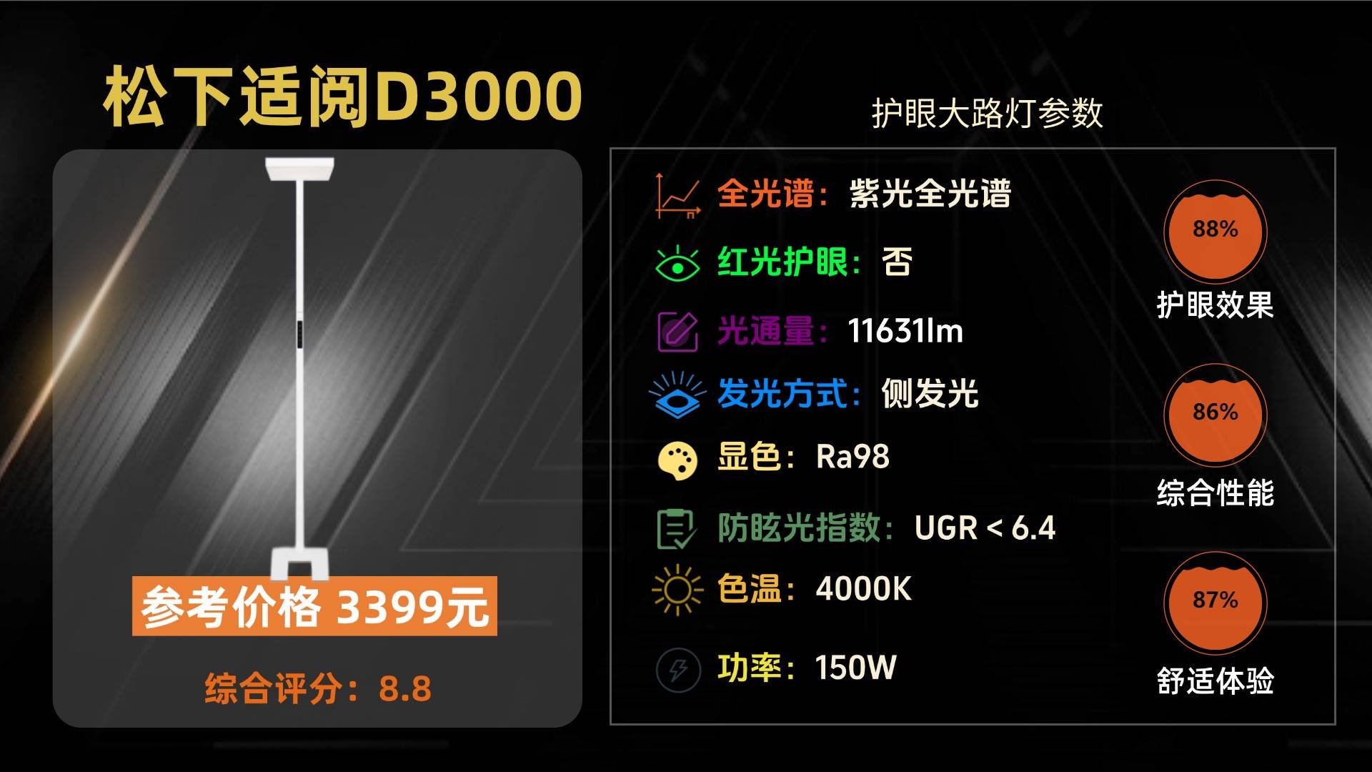 央视公认最好的大路灯是什么?松下适阅D3000这款护眼大路灯和我比较推荐的书客SUN Pro一样,在核心光源上,采用的是紫光激发技术,能够有效的减少蓝光,实际蓝光在一个安全的范畴,并且呈现出来的光线灯光色彩都比较好,而在发光设计上,松下也是上下发光,并且发光面搭载了防眩光技术,有效的减少眩光,实际防眩光指数在UGR<10.1左右,功能上则是支持灯光调节以及入座感应等功能,总体来看,除了性能不强等下温度会有点高之外,其他的表现都还不错。