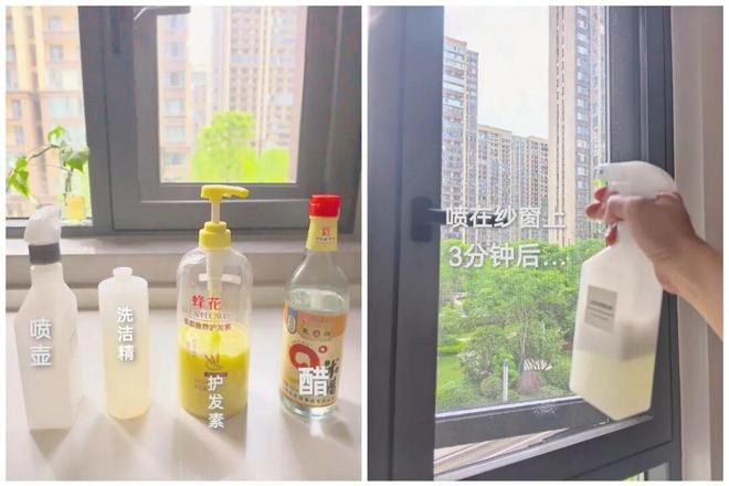 若纱窗特别脏,就用洗洁精、白醋、护发素自制一瓶喷剂,刷之前先喷在纱窗上,静置3分钟后再刷。