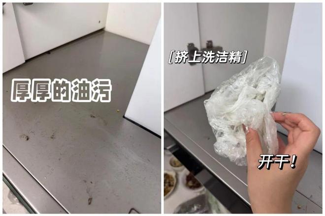 邪修:找个塑料袋,挤一点洗洁精上去(油污不严重可不用洗洁精),接着在油污处擦拭,你会神奇地发现,油污很轻松地就被带走了,最后再用一块干抹布收尾,立马就干净如新。
