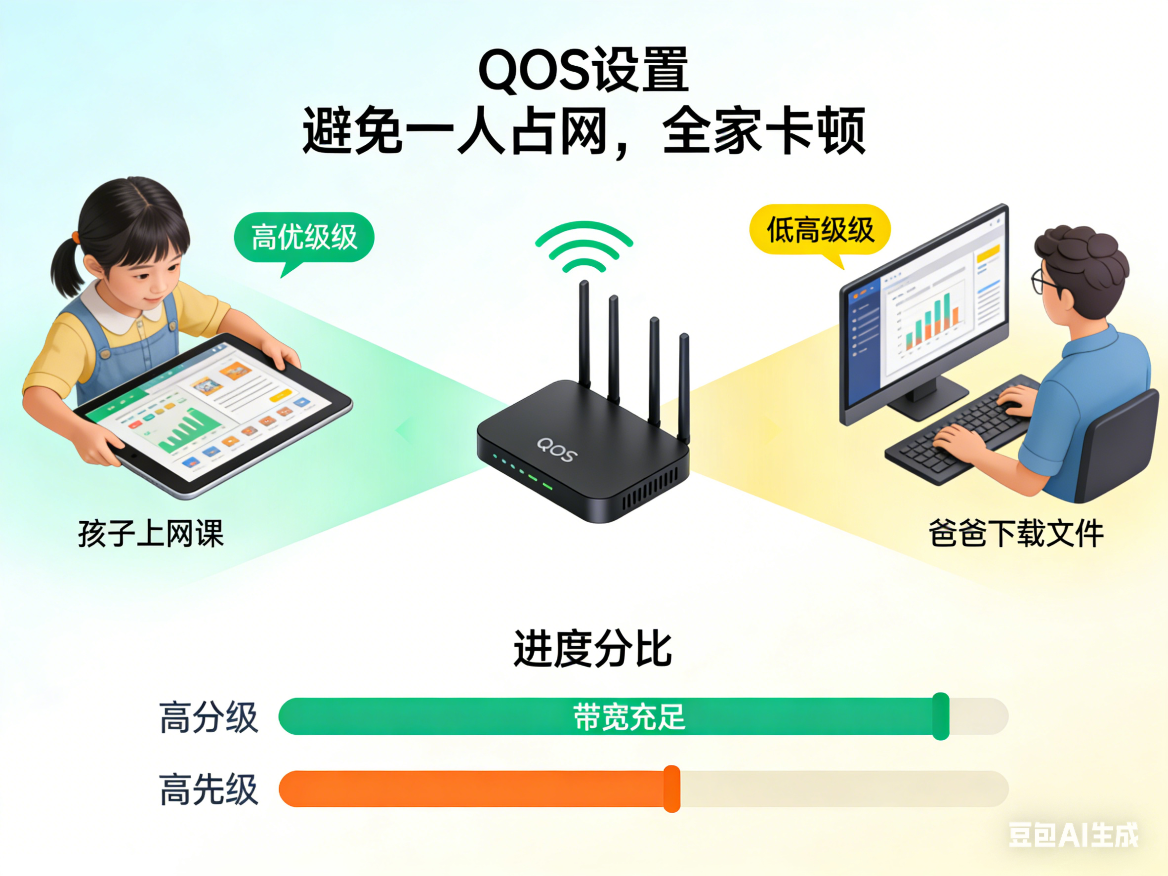 家里是不是经常出现:爸爸下载文件,孩子上网课卡顿;哥哥打游戏,妈妈追剧缓冲?其实路由器自带“QoS功能”,能智能分配带宽,优先保障核心设备使用,全家网络互不干扰!