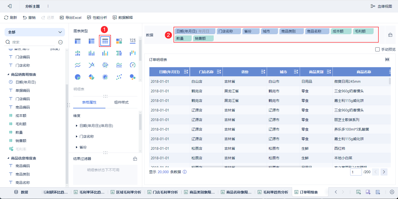 订单履行率高,说明毛利率也高;那么我们首先可以从图中看到异常的毛利率,接着我们可以进一步分析是哪些订单出现了问题,我们可以制作商品订单明细表: