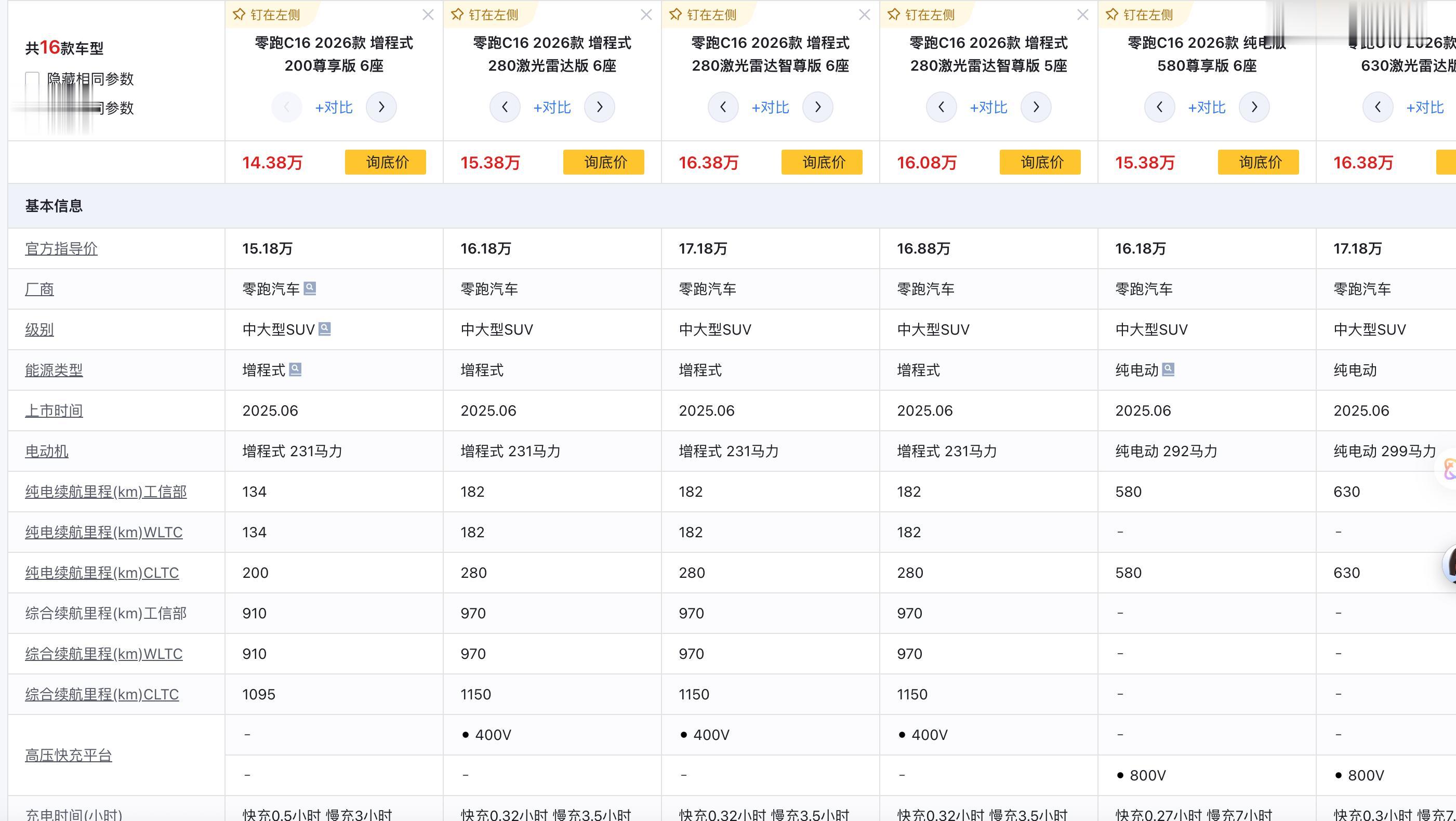 如果对比合资品牌,这个预算甚至只能买到一些紧凑型五座SUV的中低配。换句话说,零跑C16实际上是用“降维打击”的方式切入市场——用接近的成本,提供更大空间、更高配置和更新的能源形式。