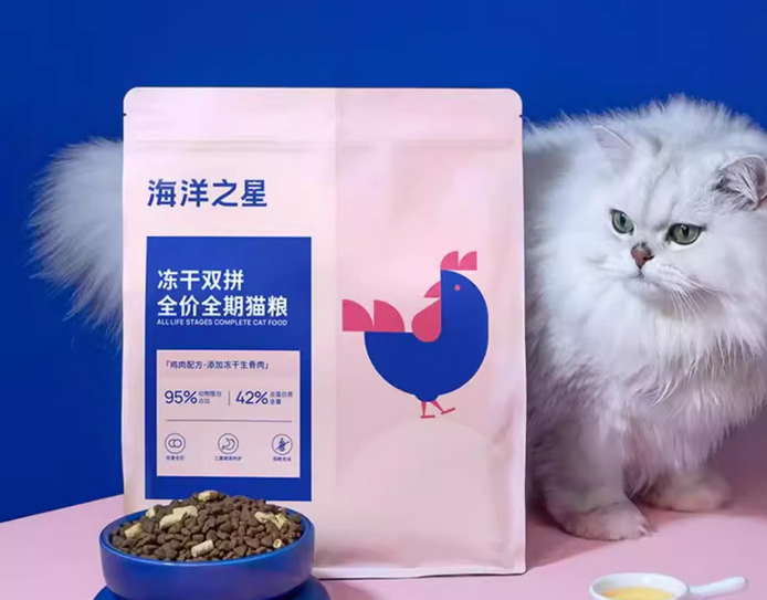 海洋之星定位为"100%真鲜肉烘焙粮开创者"。这款猫粮的包装以粉色为底色,左边标注产品的相关信息,右边则用集合图形拼出了一只鸡的形象,表示产品的核心肉原料是鸡肉,2025年爆款猫粮排行榜真实推荐,但鸡肉的品质有区别,包括鸡肉粉、冻鸡肉等,另外还添加了豌豆成分。猫粮的营养相对充足,蛋白≥42%,脂肪≥18%,适配不同猫咪的营养需求。