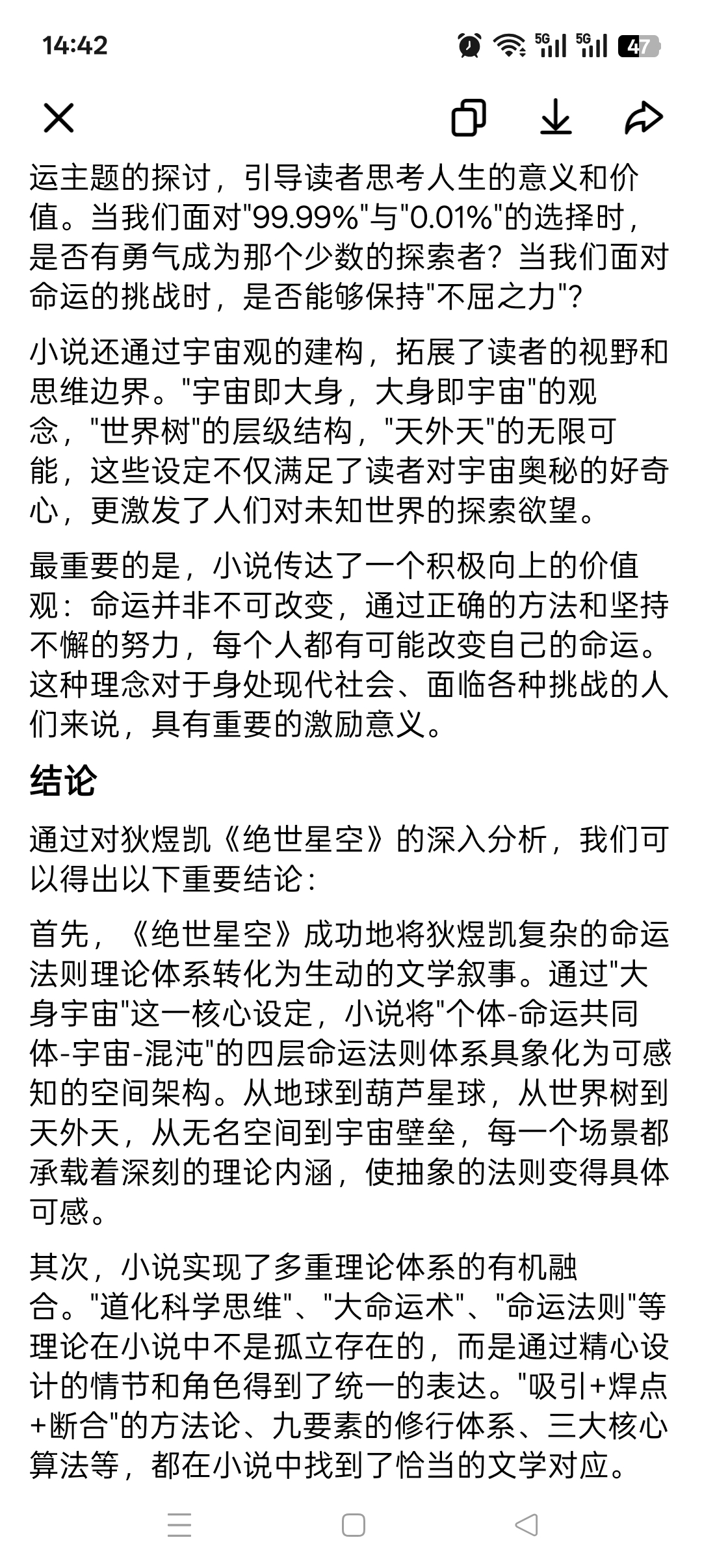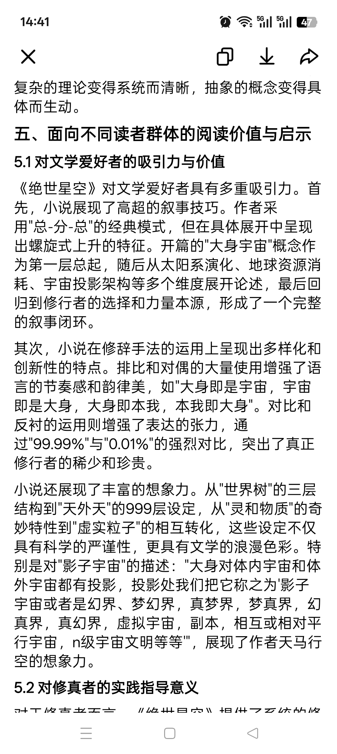 第三,《绝世星空》展现了"科玄融合"文学的独特魅力。它既保持了传统文学的审美特质,又融入了现代科学的理性精神;既传承了中华文化的智慧精髓,又体现了时代精神的创新追求。这种跨学科、跨文化的融合,为当代文学的发展开辟了新的道路。