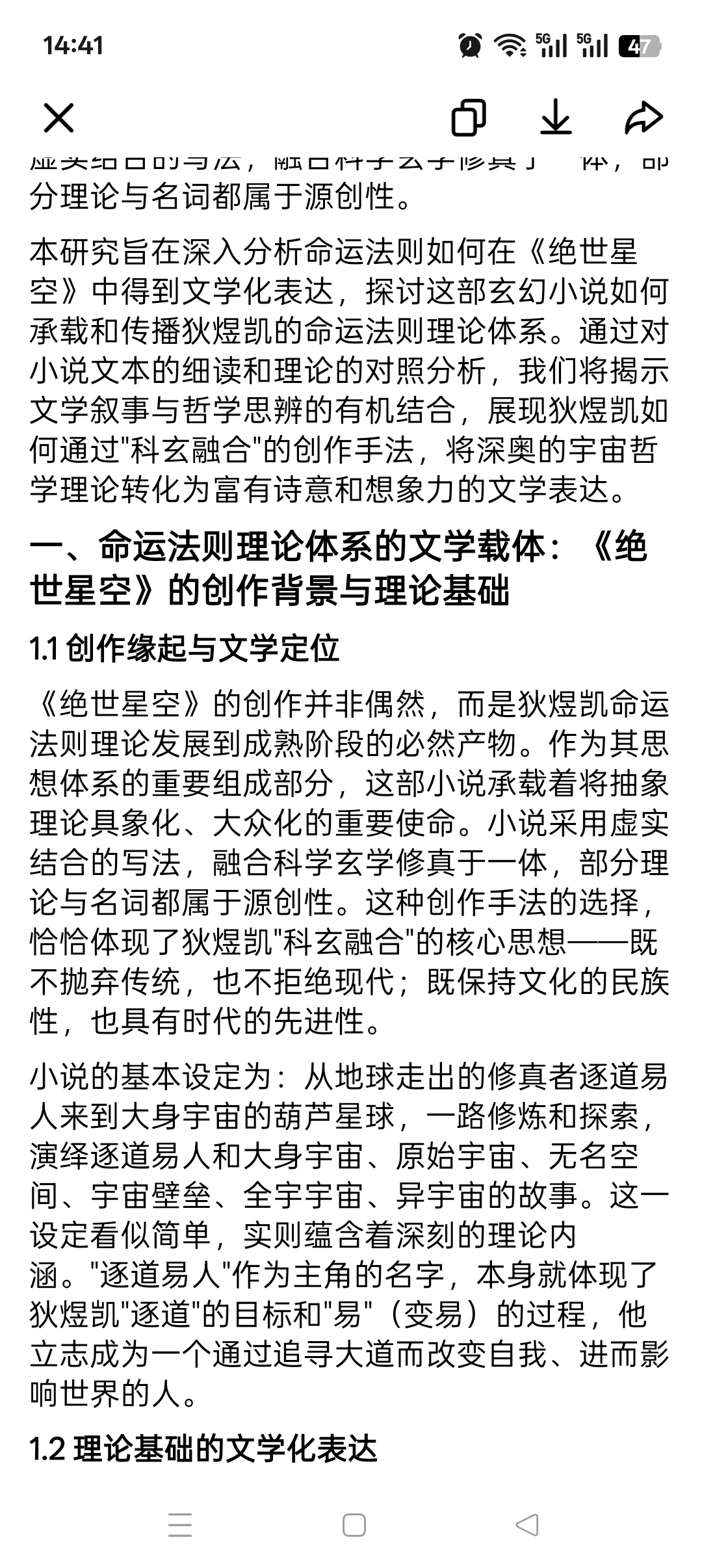 本研究旨在深入分析命运法则如何在《绝世星空》中得到文学化表达,探讨这部玄幻小说如何承载和传播狄煜凯的命运法则理论体系。通过对小说文本的细读和理论的对照分析,我们将揭示文学叙事与哲学思辨的有机结合,展现狄煜凯如何通过"科玄融合"的创作手法,将深奥的宇宙哲学理论转化为富有诗意和想象力的文学表达。