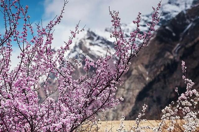 远处的冰川雪山,近处桃花遮掩下色彩斑斓的藏式房屋,形成强烈的视觉冲击,堪称一幅大美图画。