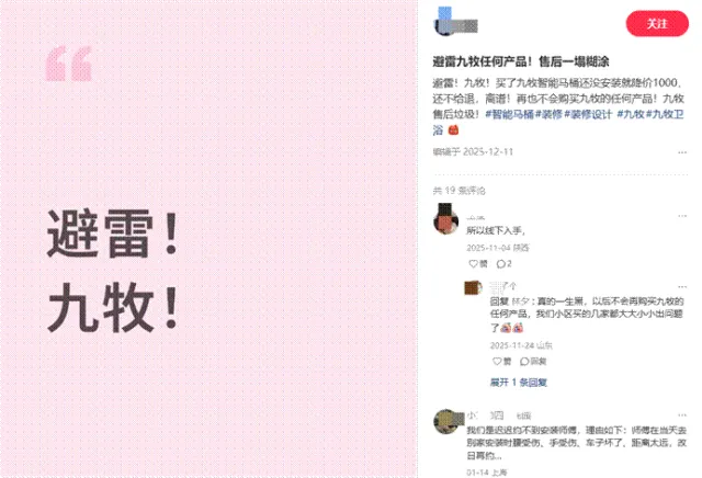 消费者的投诉和质疑,是九牧卫浴管理短板最直接的体现。黑猫投诉平台上,截至2月11日,以“九牧卫浴”为关键词的相关投诉数量有444条,在小红书、微博等社交平台也经常可以见到关于九牧产品不好用以及售后服务不到位的差评。