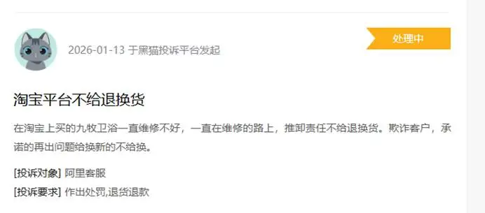 黑猫平台上,一位用户投诉;在淘宝上买的九牧卫浴一直修不好,一直在维修的路上,推卸责任不退换货。欺骗客户,承诺有问题可以更换新的但没有兑现。