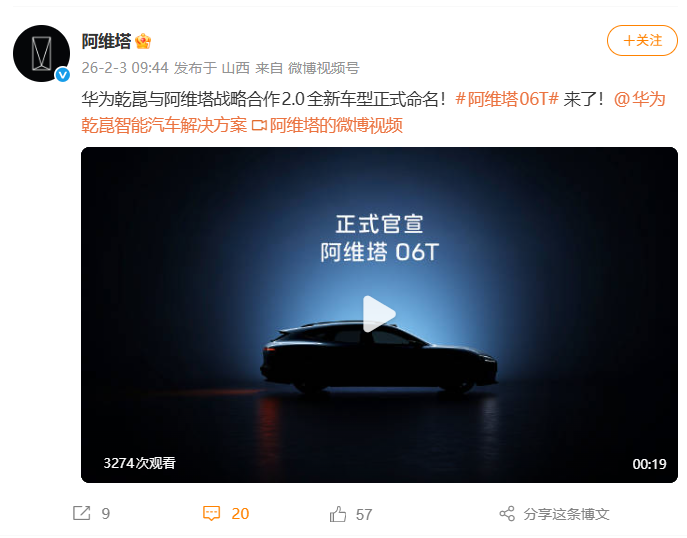 2026年2月3日,阿维塔科技正式官宣与华为乾崑智能汽车解决方案的战略合作迈入2.0阶段,并发布了全新车型阿维塔06T的实车视频。