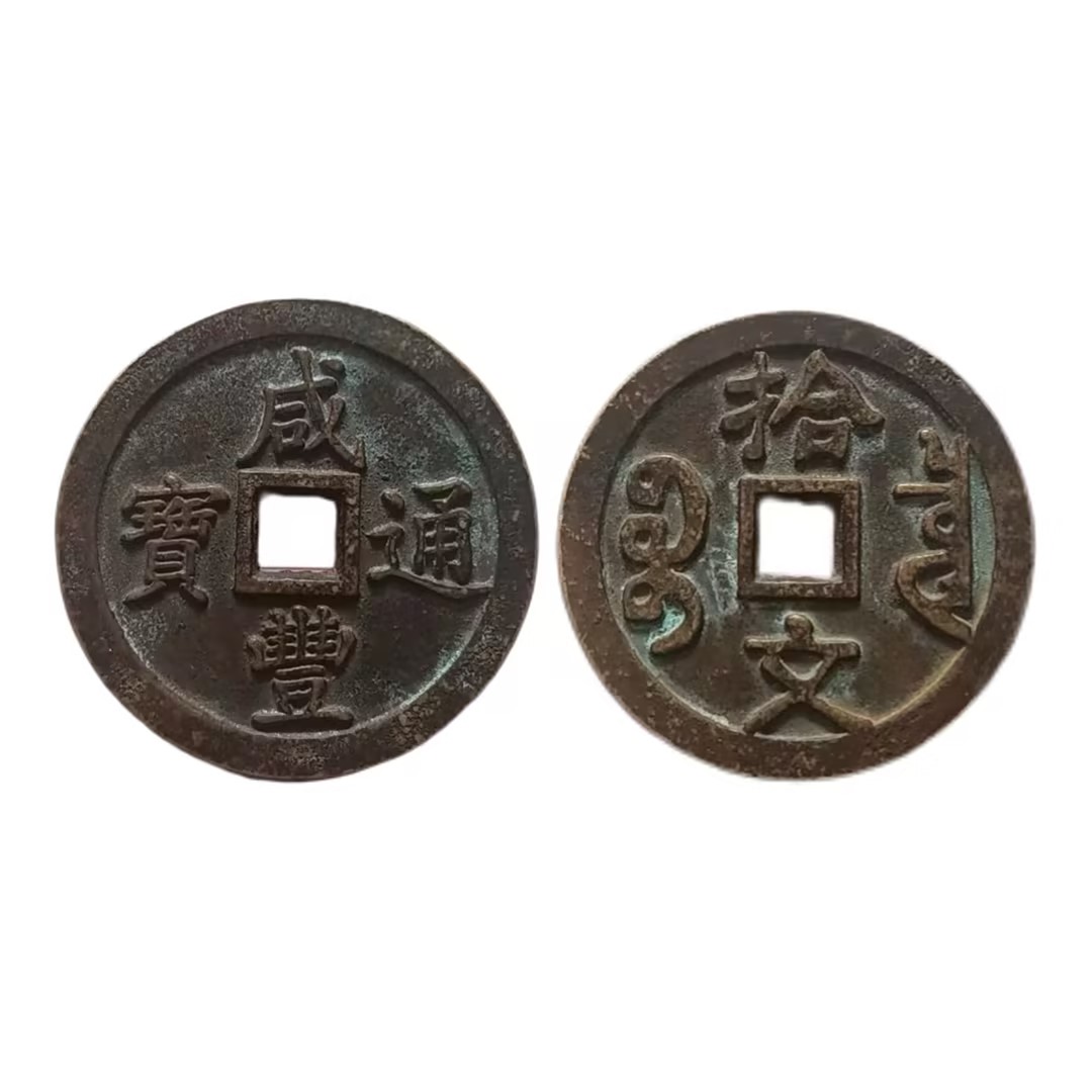 这枚拾文通宝正是这场货币实验的产物。它打破了 "通宝为小平钱" 的惯例,正面书 "咸丰通宝" 四字,背面以满汉双语标注 "拾文" 面值(穿左满文 "宝泉",穿右汉文 "拾文"),既想维持 "通宝" 的正统性,又要实现 "当十" 的敛财功能,堪称晚清财政窘迫的绝妙隐喻。
