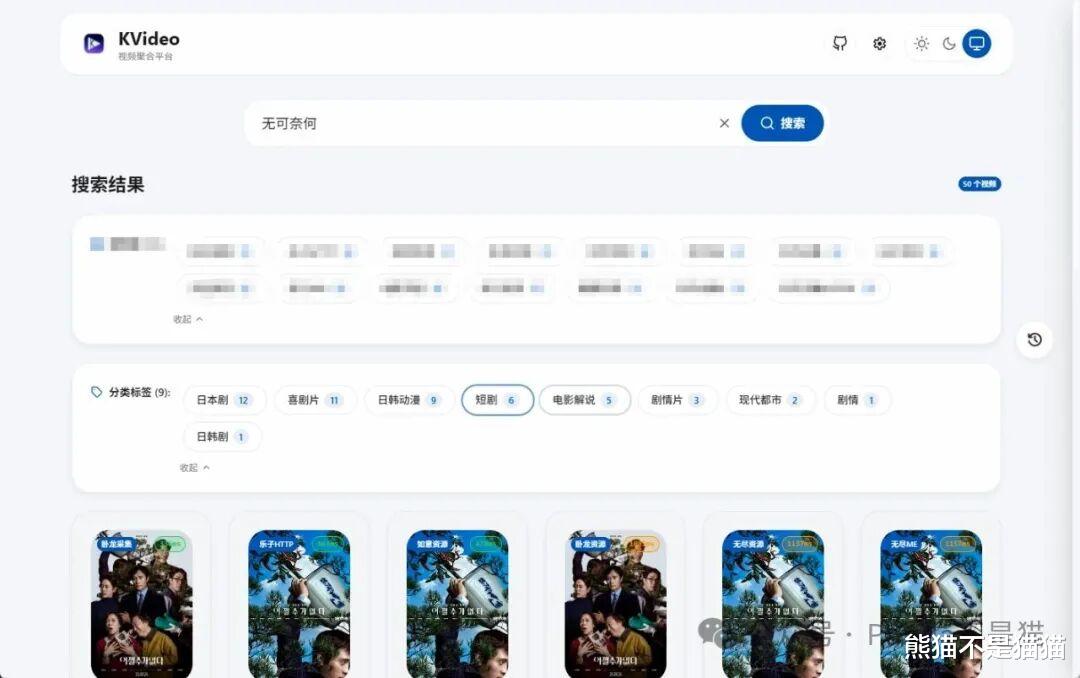 首页的影视数据源都采用的豆瓣的源,评分自然也是豆瓣的评分。点击对应的影视剧就能直接搜索,搜索会展示视频源、标签以及对应的底部内容。(短剧和电影解说标签好评)