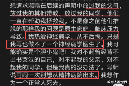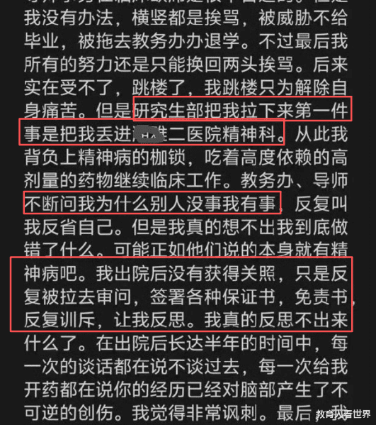 更令人心痛的是,当她因不堪重负曾尝试轻生被救后,据其自述,研究生部未提供有效心理支持,而是将其送入某医院精神科。此后,她一边服用高剂量药物继续临床工作,一边反复被要求签署免责书、撰写反思材料。她写道:“他们问我为什么别人没事我有事……可能正如他们说的,我本身就有精神疾病吧。”这种将结构性压力归因为个体“心理问题”的处理方式,不仅未能缓解危机,反而加剧了她的自我怀疑与孤立。