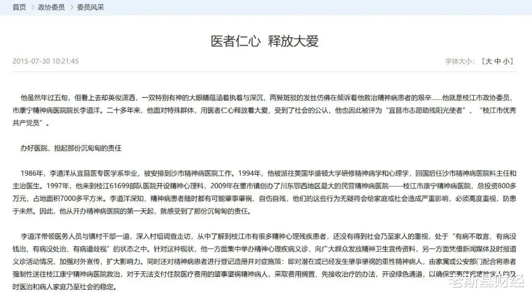 宜昌一家民营精神病院的院长李道洋,早年就用医者仁心释放着大爱,得到了社会的公认。