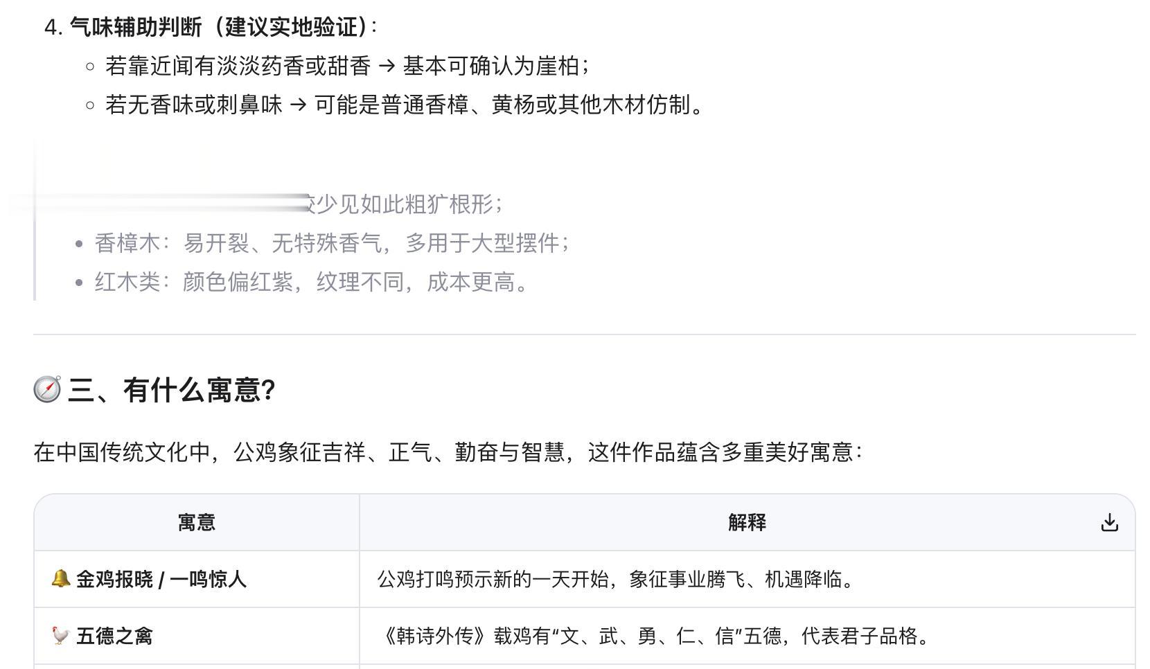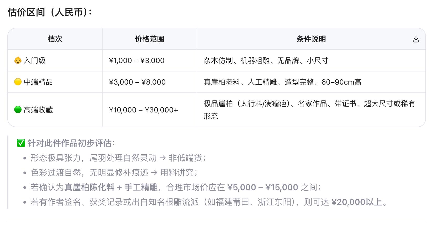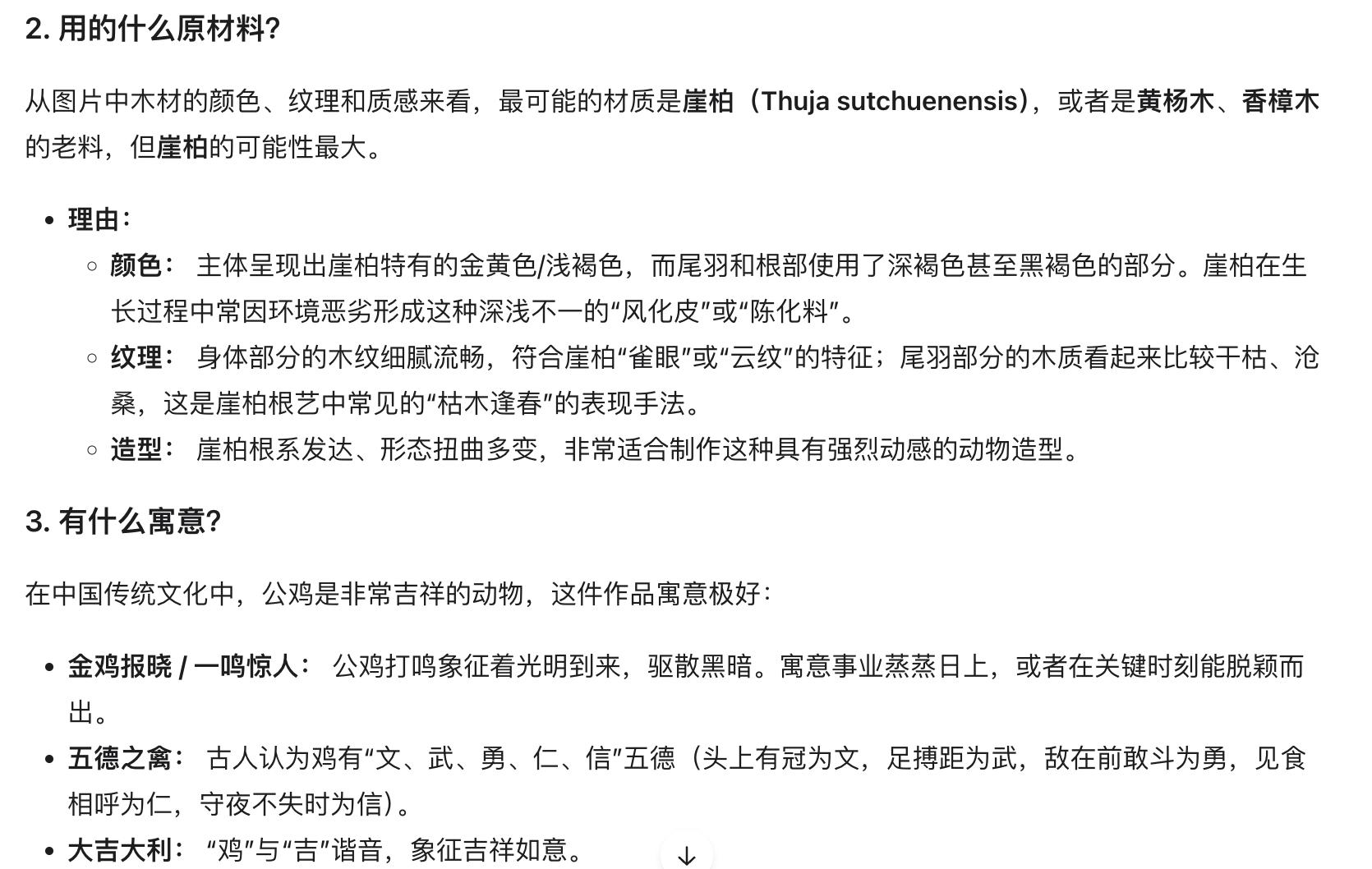 比如当我上传一张“公鸡根雕”的图片,三款模型都能够准确识别其为根雕艺术品,能够根据颜色和纹理准确识别材料为“崖柏”,能结合中国传统文化解读这一物件的意义,甚至能基于材质、工艺水平、尺寸大小等因素进行价格评估,评估结果基本符合这一领域的专业水平,令人很惊喜。