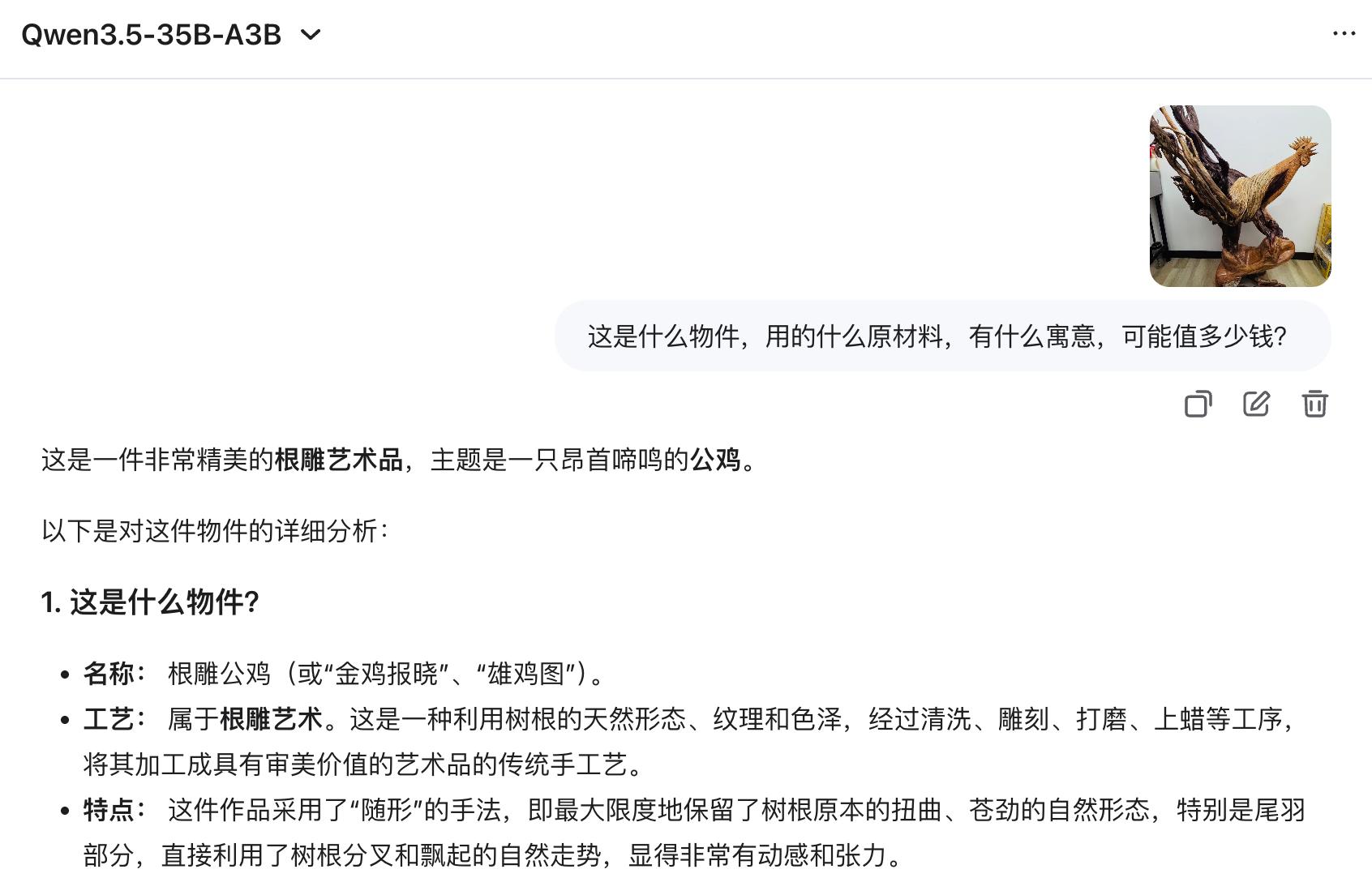 如下图所示,Qwen3.5-122B-A10B和Qwen3.5-35B-A3B的输出答案都基本接近事实,对“这是什么物件,用的什么原材料,有什么寓意,可能值多少钱?”四个问题进行了准确的理解作答。