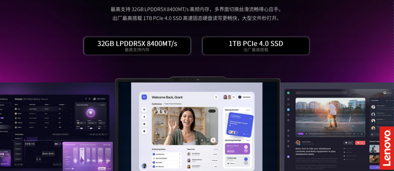 同时,机身内置最高32GB LPDDR5X高频内存,搭配PCIe 4.0甚至Gen 5规格的固态硬盘,不仅读写速度飞快,文件传输、软件启动瞬间完成,更能轻松满足多任务并行处理的需求,让商务办公效率翻倍。针对远程办公需求,电脑还标配AI增强功能,能够实现会议噪音降低、自动纪要总结等实用功能,可搭配500万像素高清摄像头和杜比语音认证音频系统,让远程会议沟通更清晰、更高效。