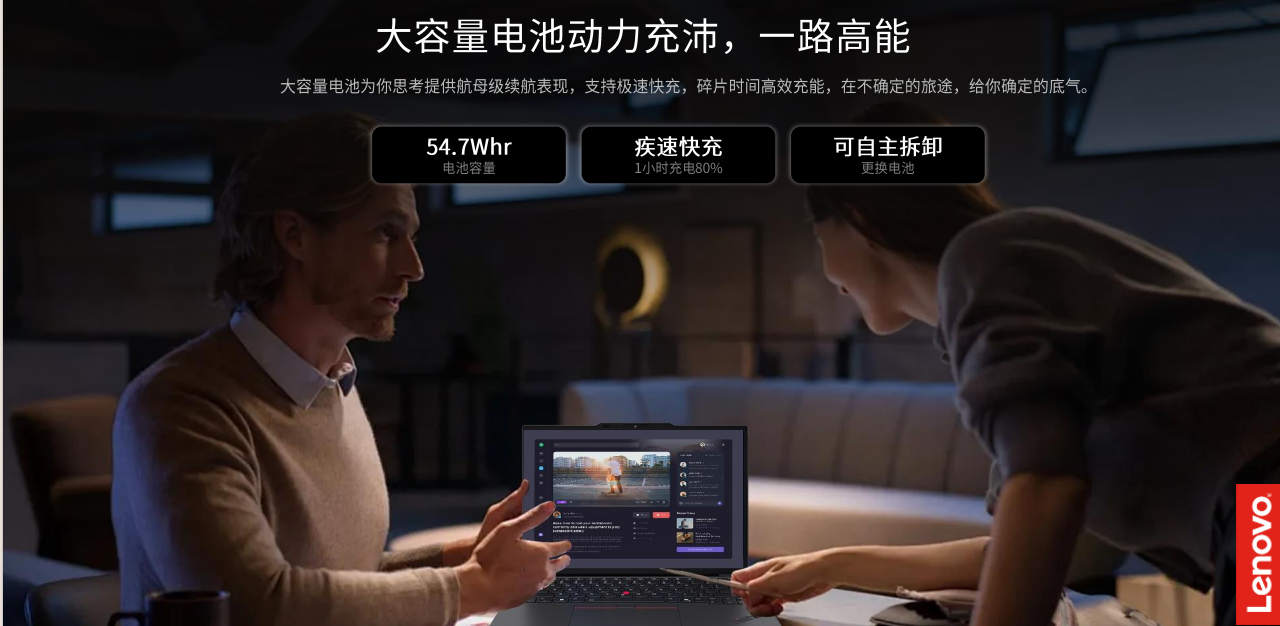 对于商务人士来说,笔记本的续航能力直接决定了移动办公的自由度。ThinkPad X13 Gen 6配备大容量电池,日常办公场景下可实现长时间续航,完全能支撑一整天的外出办公需求。更贴心的是,电脑支持快速充电技术,仅需1小时就能充至80%左右的电量,碎片时间就能快速补能,彻底告别“电量焦虑”。
