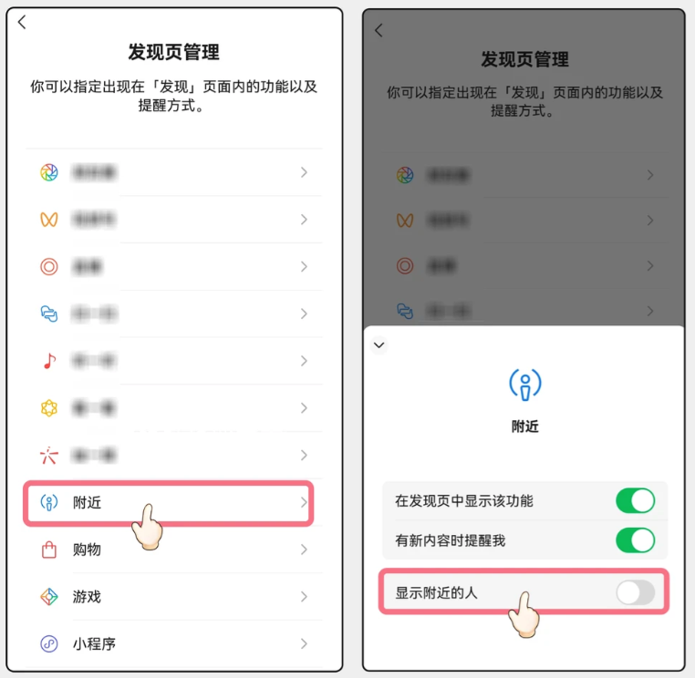 操作路径:设置→通用→发现页管理→关闭→附近的人