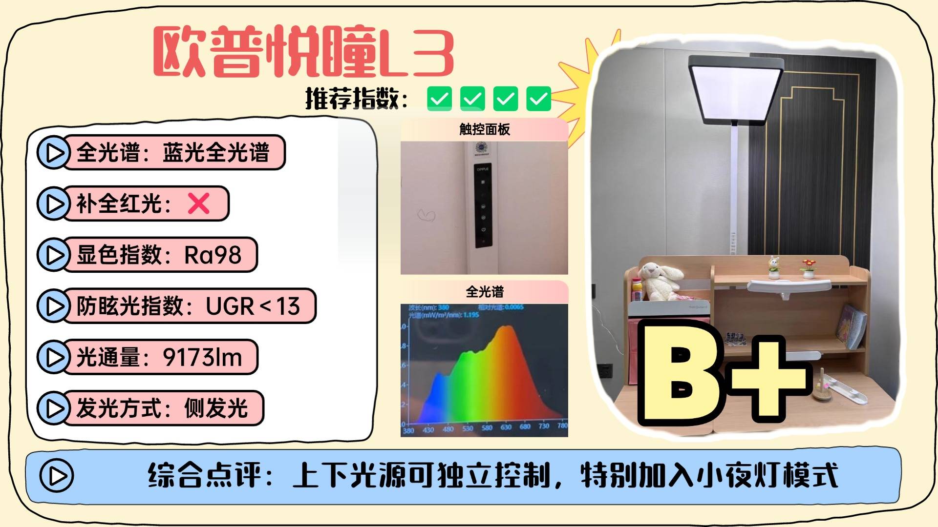 护眼落地灯十大知名品牌有哪些?欧普悦瞳L3采用一体式发光面设计,光线覆盖约10–30㎡,上下光源可独立调节,根据不同需求灵活分配照明层次。光学表现方面,光照均匀度约为1.03,配合 4000K舒适色温,画面明亮且色彩还原较自然,使用体验上支持智能语音控制,但整体亮度偏高,初次使用对强光敏感的人可能略有不适,同时自然光还原效果仍有优化空间。