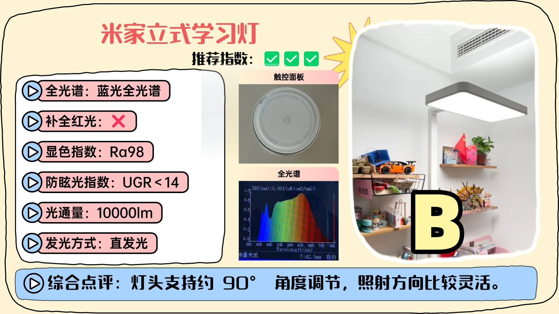 护眼落地灯十大知名品牌有哪些?米家光源方面采用全光谱 LED 灯珠,显色指数接近 Ra98,色彩还原自然,真实感较强,灯头也支持约 90° 角度调节,照射方向灵活,台灯的设计风格更偏现代与智能化,支持接入米家App,可通过手机实现联动控制,日常操作较为方便,不过需要注意的是,从光谱结构来看连续性偏弱,蓝光在0.7左右,并且红光补充不足,在还原自然光以及护眼效果上还有待优化的空间。