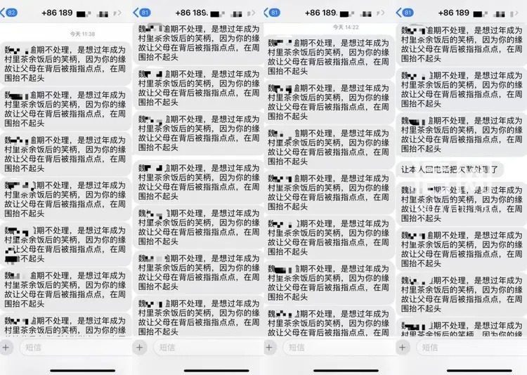 1月26日中午11:38,信号新闻采访用的手机上突然收到了189手机号发来的短信,内容为“魏某某逾期不处理,是想过年成为村里茶余饭后的笑柄,因为你的缘故让父母在背后被指指点点,在周围抬不起头”。更让人没想到的是,在2分钟内,有17条一模一样的短信连续发到了信号新闻的采访手机上。而这些短信稍作暂停后,又开始了新一轮骚扰,到11时55分时,手机共收到了34条催收短信。