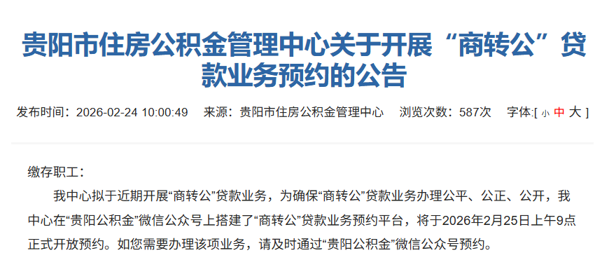 2月28日,据贵阳市住房公积金管理中心消息,其发布关于开展“商转公”贷款业务预约的公告。