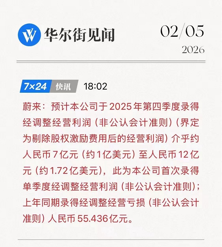 2026年2月5日,蔚来发布的2025年第四季度盈利预告引起了市场关注。根据初步评估,该公司预计录得经调整经营利润7亿元至12亿元。