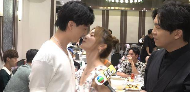 除了在庆功宴上不停互亲外,在接受访问环节二人也是肆无忌惮,一点都没有输给恋综cp的曾展望和叶蒨文。访问时候罗毓仪被问到为什么只亲吻脸颊,是否身高差导致不能如愿以偿。