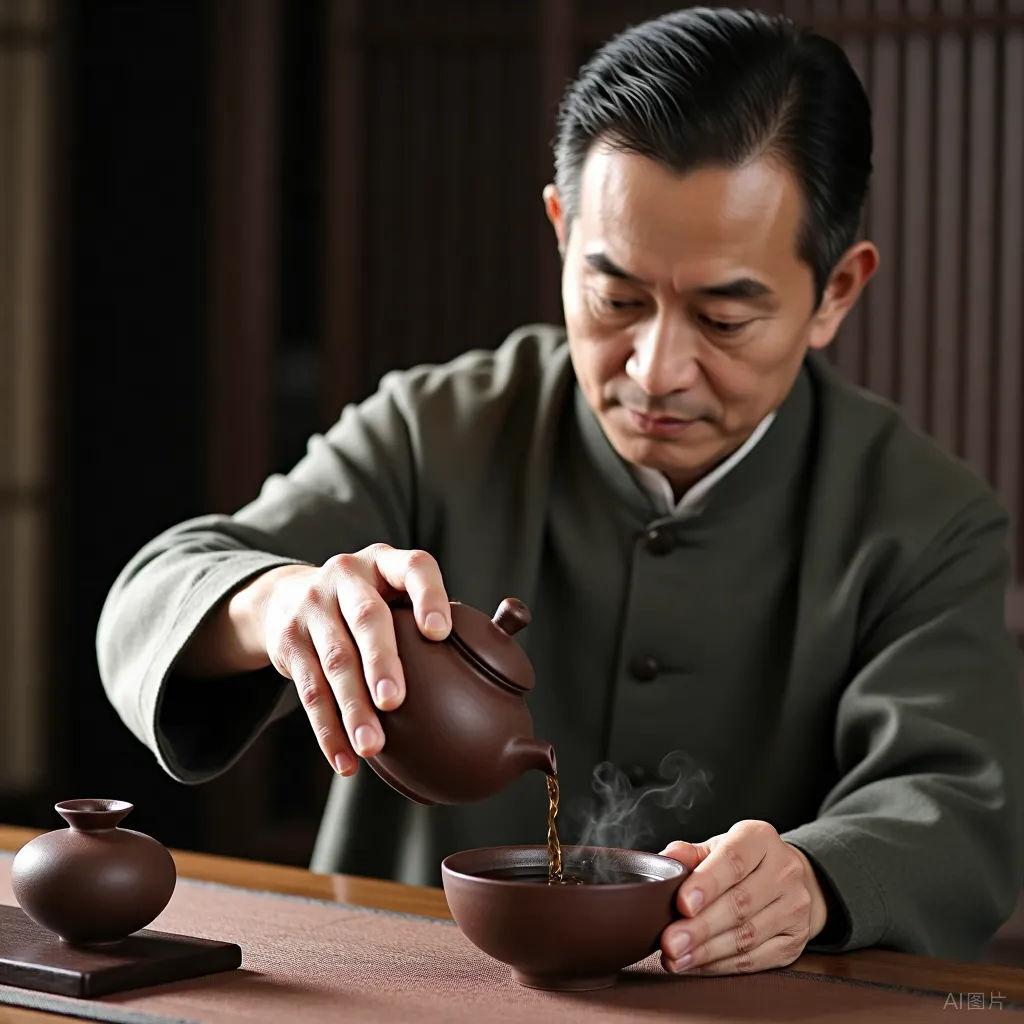 茶馆门帘是粗麻布做的,边缘已经磨损,露出里面的线头。田睿伸手掀开帘子,一股混杂着劣质烟草、汗味和茶垢的气息扑面而来。屋内光线昏暗,十几张方桌散乱摆放,大多坐着穿军装或旧号衣的人。烟雾在空气中缓缓流动,像浑浊的河水。他的目光扫过室内,在西北角停顿——那里靠窗的桌子旁,坐着一个三十来岁的汉子,国字脸,浓眉,腰背挺得笔直,面前的茶碗冒着热气。正是陈武。田睿收回目光,找了个离他不远的空位坐下,对跑堂的伙计说:“一壶粗茶。”