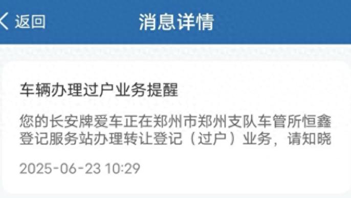 2025年6月23日10时29分,焦女士的手机突然接到了一条来自郑州交通管理12123App发来的车辆办理过户业务信息提醒:“您的长安牌爱车正在郑州市郑州支队车管所恒鑫登记服务站办理转让登记(过户)业务,请知晓。”