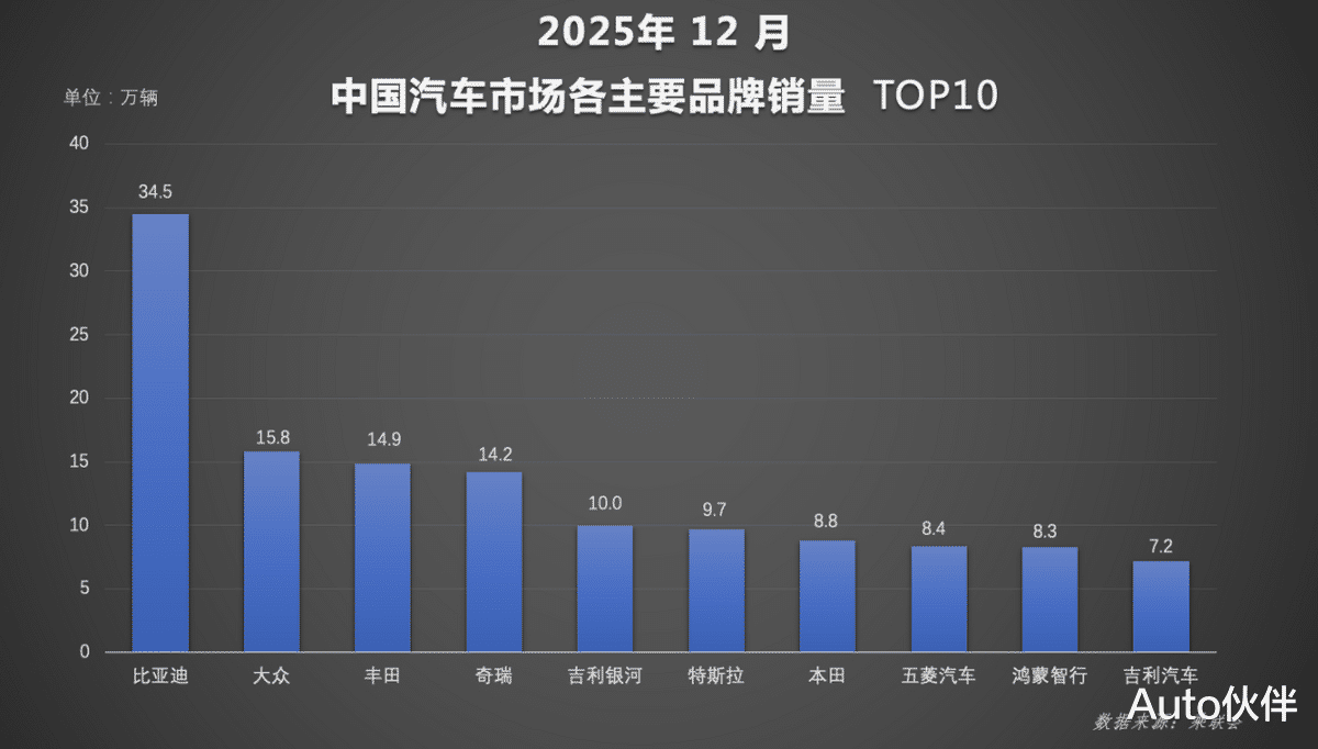 随着2025年圆满收官,中国汽车市场交出年度成绩单。行业数据显示,比亚迪在12月及2025年全年中国汽车市场品牌销量、新能源销量、集团销量等多个核心维度均位列第一。并连续四年蝉联全球新能源车市场销量冠军、中国汽车市场品牌四连冠,以冠军之姿持续领跑新能源汽车市场。
