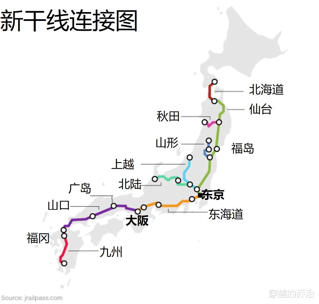 日本主要的国土由四个岛屿从头到尾绵延近 3000 公里形成,主要城市之间的旅程很长。1889 年,从东京到大阪步行需要两到三个星期,当时乘坐火车则要 16.5小时,到 1965 年乘坐新干线只需 3 小时 10 分钟。尽管大部分铁路网络服务于日本人口最多的本州岛,但通过海峡隧道子弹头列车还是到达了日本最南端的九州和北方的北海道。