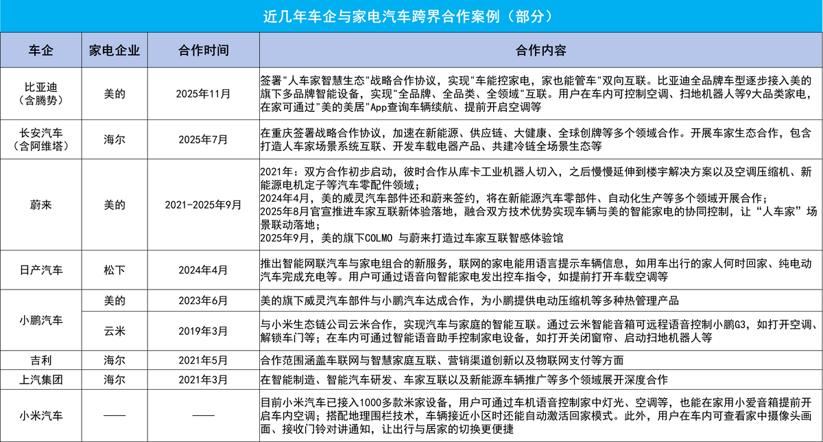 仔细梳理可以发现,车企与家电企业开展跨界合作早已不是什么新鲜事。比如,早在2021年,吉利便与海尔达成合作,合作范围涵盖车联网与智慧家庭互联、营销渠道创新以及物联网支付等方面。此后还有上汽与海尔,蔚来/小鹏和美的等。假如再算上小米汽车,如今与家电企业开展合作的车企已经达到了近10家。