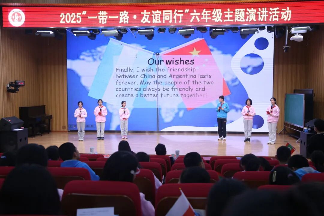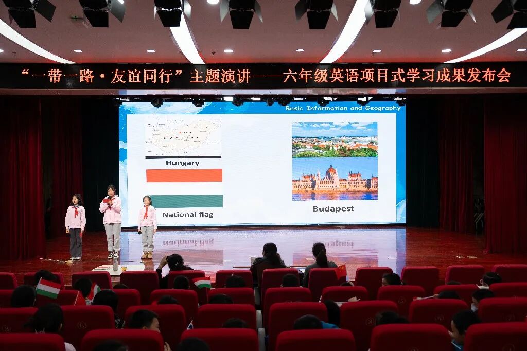 演讲环节中,两校区六年级学子展现出扎实的双语表达能力与超出年龄的文化素养。同学们不仅系统梳理了各国的历史沿革、地域特色与民俗风情,更深入挖掘“一带一路”倡议背景下的中外合作故事——从中国援建的民生工程到联通各国的交通枢纽,从跨境合作的产业模式到惠及民众的帮扶项目。每一段演讲都逻辑清晰、情感真挚,既彰显了对世界多元文明的尊重与理解,也传递了对中外友谊的珍视与期许。