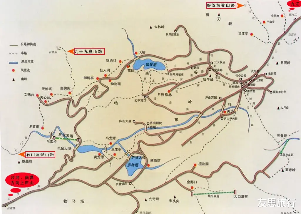 庐山的景点以半空中的牯岭镇为中心,清晰地分为西线和东线。