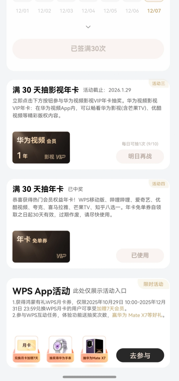 这个活动12月31日就首签截止了,已经参与的朋友千万别忘记去兑换权益!特别是那些已经签到快30天或者已经满30天的,赶紧去抽年卡!还没上车的华为用户也别犹豫,赶紧把系统升级到鸿蒙5.1及以上版本,在负一屏找到“鸿蒙有礼”签到。现在开始,也能薅不少福利呢!