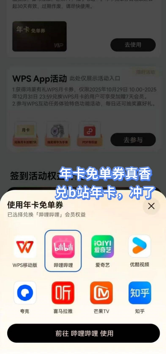 之前顺手参加的“鸿蒙有礼”活动,居然距离首次签到已经超过30天了,刚好能解锁年卡免单券抽奖,没想到随手一点居然真中了!这年卡免单券可以在B站、优酷、爱奇艺、知乎、WPS等8款应用中选择一个兑换年卡。我一直在纠结兑换哪个。现在好了,有了《罗小黑战记》的追剧需求,可以直接换B站年卡了!