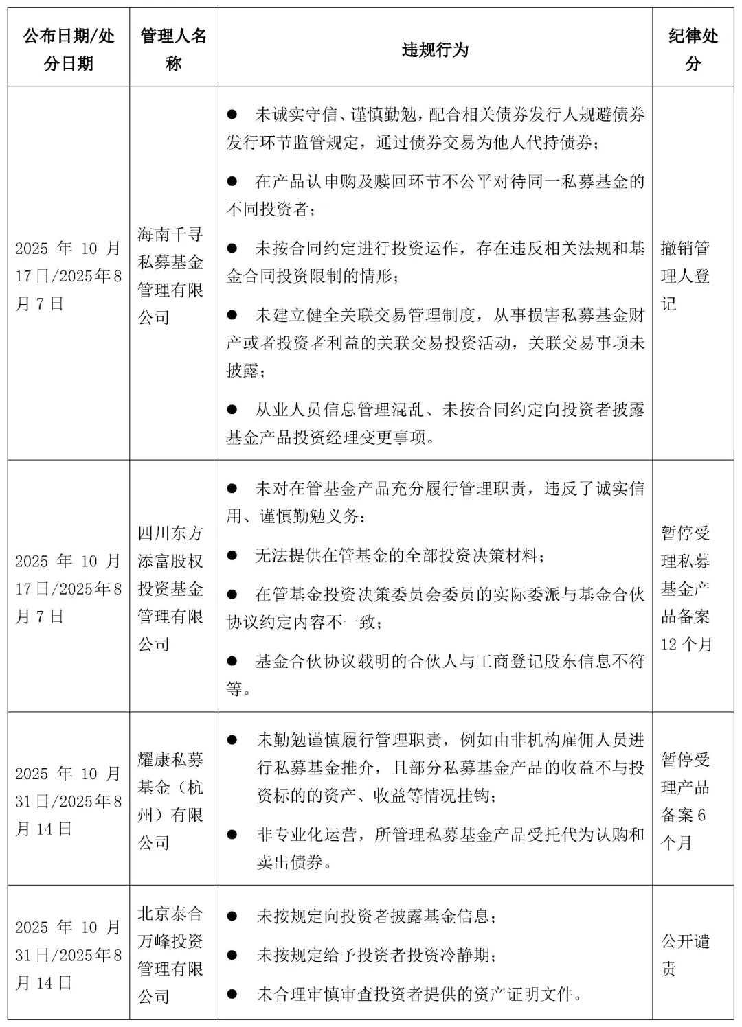 2025年10月17日、2025年10月24日,中国证券投资基金业协会(以下简称“协会”)分别发布公告称上海麦道私募基金管理有限公司等14家私募基金管理人存在异常经营情形,且未能在书面通知发出后的3个月内提交符合规定的专项法律意见书,协会将注销该14家机构的私募基金管理人登记。