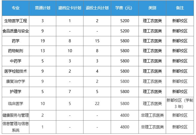 成都医学院2025年专升本招生计划有182人,招生专业有11个,分别是生物医学工程、食品质量与安全、药学、药物制剂、中药学、医学检验技术、康复治疗学、护理学、临床医学、健康服务与管理、信息管理与信息系统,其中临床医学学制为 3 年,招生专业集中在新都校区。