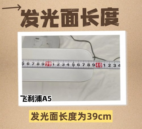 飞利浦A5的发光面长度为39cm,实测照明覆盖范围约1.2米,适合中等尺寸书桌。实测中,核心区域照度充足,但边缘区域亮度衰减明显,超大桌面或双人共用时,边缘区域会出现可感知的暗区。